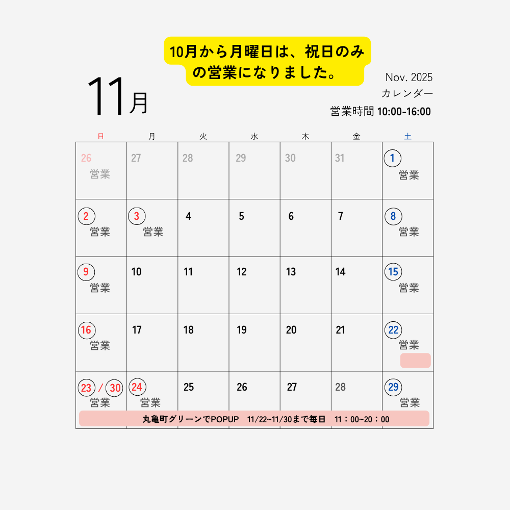 <営業日> 土・日・祝日の月曜日<営業時間> 10:00~16:00