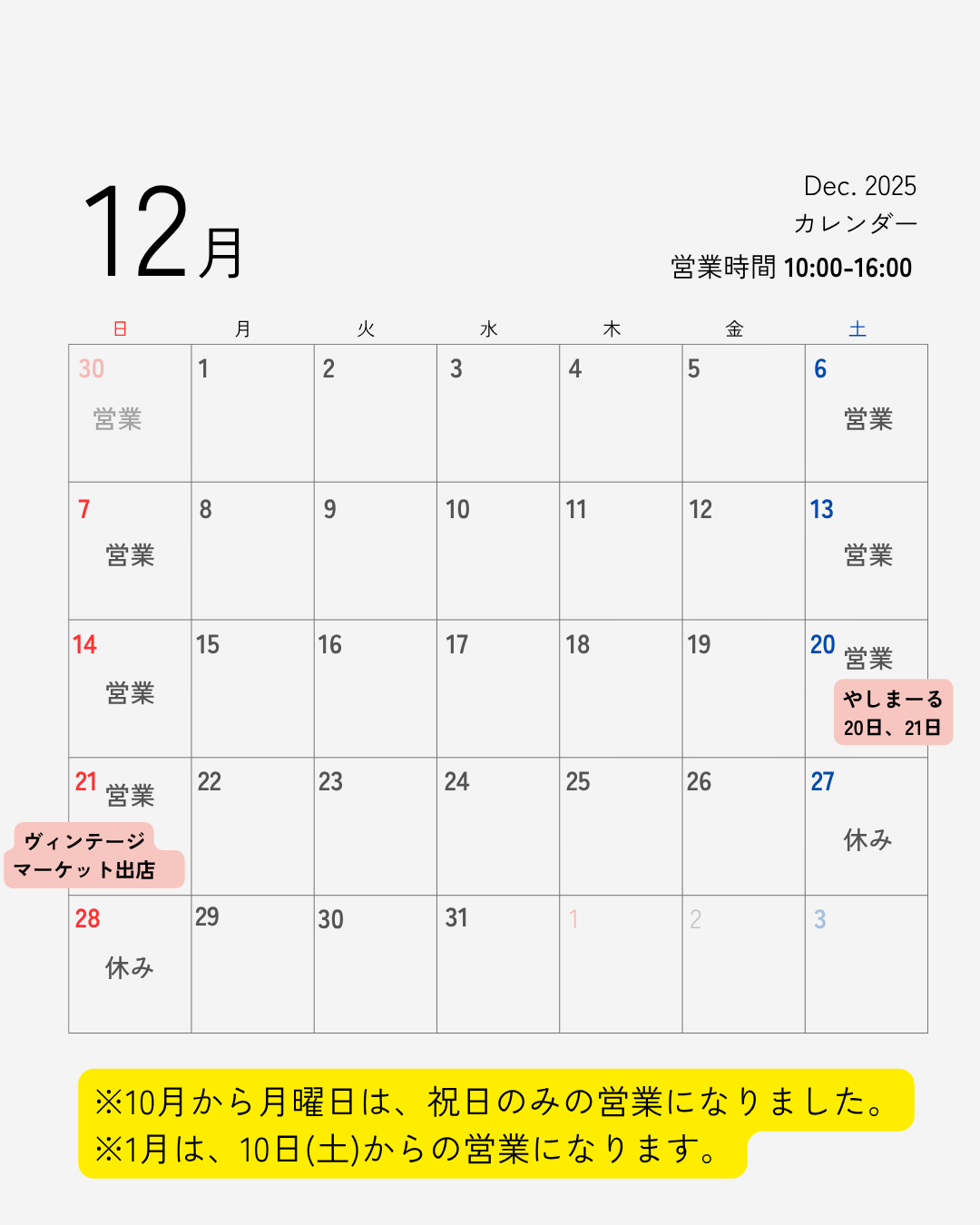 <営業日> 土・日・祝日の月曜日<営業時間> 10:00~16:00